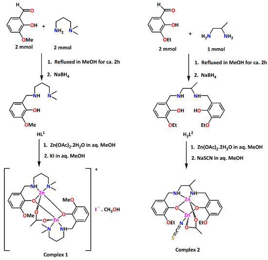 In this work, two acetate bridged dinuclear zinc complexes have been synthesized using reduced Schiff bases HL1 and H2L2 as ligands. HL1 was prepared by 1:1 condensation of 3-methoxysalicylaldehyde and N,N-dimethyl-1,3-diaminopropane in methanol and subsequent reduction using NaBH4 following a literature method [13,14,15]. In the same way, H2L2 was prepared by 2:1 condensation of 3-ethoxysalicylaldehyde and rac-1,2-diaminopropane in methanol followed by the reduction with NaBH4. Methanol solution of HL1 on reaction with zinc acetate dihydrate and potassium iodide in a 2:2:1 molar ratio produced complex 1. On the other hand, methanol solution of H2L2 on reaction with zinc acetate dihydrate and sodium thiocyanate in a 1:2:1 molar ratio produced complex 2. The synthetic routes to the complexes 1 and 2 are shown in Figure 1.