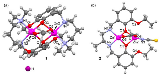 Compound 2 (Figure 2b and Supplementary Figure S4) crystallizes in the triclinic space group Pī and does not contain additional ions or solvent molecules in its asymmetric unit. Zn2 is N-coordinated to the thiocyanate, connected to O6 of the bridging acetate and bound to two bridging phenolate O-atoms to form a distorted tetrahedron (see Supplementary Figure S5). Zn1 is situated in a distorted square pyramidal environment where the ligand [O1,N1,N2,O3] donor atoms form the base of the pyramid and O5 of the bridging acetate is at the apex. The coordination distances of compounds 1 and 2 are given in Table 1 and range from 1.92 to 2.21 Å. These distances are similar or slightly longer that the sum of covalent radii (ΣRcov = 1.93 and 1.86 Å for Zn+N and Zn+O, respectively) and can be considered as normal [16].