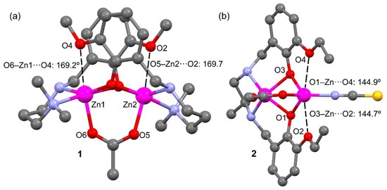 Table 1 also gathers longer Zn···O distances (values in italics) where the O-atom belongs to the methoxy (in L1) or ethoxy (in L2) substituent of the aromatic ring. These distances are around 0.8 Å longer than ΣRcov and, consequently, can be considered as intramolecular spodium bonds, as further analyzed below. These interactions are depicted in Figure 3 as black dashed lines. In compound 1 the SpBs are located opposite to the Zn–O(acetate) coordination bonds at an angle of ~170°. In compound 2, the ethoxyde O-atoms are located opposite the phenoxy O’s at an angle of ~145°. These differences in O–Zn···O angles likely originate from the different geometries involved; the square pyramidal geometry in 1 leaves ample space for an additional donor atom (SpB) while the accessible space at the tetrahedral Zn in 2 is more restricted.