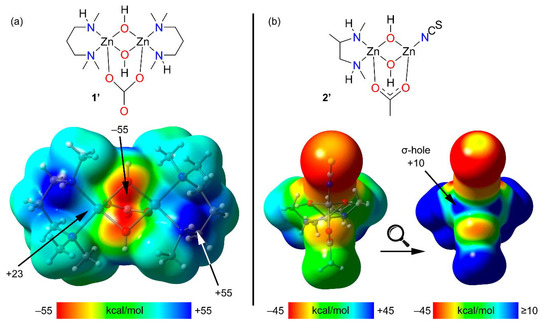Theoretical models of 1 and 2 (1′ and 2′, see Figure 4, top) have been used to investigate the existence of σ-holes at the Zn atoms. The utilization of such models is needed because in the real systems the potential σ-holes are “hidden” as a consequence of their intramolecular interaction with the electron rich O-atoms. In these models the aromatic rings were eliminated to leave hydroxides as bridging ligands instead of a phenoxides. The geometry of the models was optimized while keeping the zinc ions and their surrounding donor atoms frozen. For comparison purposes, the acetate bridging ligand in 1 has been replaced by a dianionic carbonate ligand in 1′ (i.e., so that both 1′ and 2′ are charge neutral).