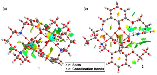 Figure 5a shows that each SpB in 1 is characterized by a bond CP and bond path connecting the O-atom to the Zn atom. Moreover, they are also characterized by blue isosurfaces in the NCI plot, thus evidencing an attractive interaction. The NCI isosurface extends toward the region in between the phenolic and methoxy O-atoms where the color changes to yellow, thus evidencing some repulsion between these atoms. It is also worth mentioning that similar isosurfaces are not present in the coordination bonds, due to their covalent character (covalent bonding is not revealed by the NCI method using the 0.004 cut-off for the electron density). In compound 2, each SpB is characterized by bond CPs and bond path interconnecting the O-atom to the Zn-atom. The NCI analysis also shows two blue isosurfaces between the Zn and the O-atoms, evidencing attractive interactions. Similar to compound 1, the isosurface extends toward the region between the O-atoms where the color is yellow, evidencing a repulsive O···O interaction. For both compounds, the bond CPs that characterize the SpBs have been labelled as “a” and “b” and two additional bond CPs that characterize Zn–O and Zn–N coordination bonds have been labelled as “c” and “d”. The QTAIM parameters measured at bond CPs a-d are summarized in Table 2. The values of ρ(r) and the Laplacian of ρ(r) at the bond CPs that characterize the SpBs are significantly smaller than those at the coordination bonds. In fact, the values at the bond CPs corresponding to SpBs are in the range of typical noncovalent interactions. For example, the densities of the bond CPs of about 0.02 is in between the 0.01 observed in a tetrel-bonding adduct and the 0.03 in a hydrogen-bonding adduct [17].