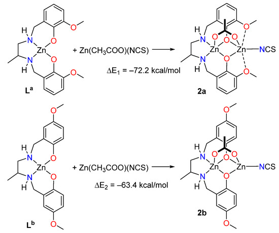 Two theoretical models have been used to evaluate energetically the SpBs in compound 2. First, a slightly modified model of 2 (denoted as 2a, see Figure 6) has been constructed where the ethoxy substituent has been changed by a methoxy group in order to eliminate the H-bonds between the ethoxy and the thiocyanate group that are present in 2 (see Supplementary Figure S11). Secondly, a hypothetical complex was calculated where the methoxy group is located para instead of ortho with respect to the phenolate O-atom (denoted as 2b). In this complex the spodium bonds cannot be formed, while the basicity of the phenolate atoms is similar to that of 2a. To estimate the intramolecular SpB energy, the formation energies of complexes 2a and 2b from the reaction of the metalloligands La and Lb (see Figure 1) with Zn(CH3COO)(NCS) have been computed. Secondly, the difference ΔE1 − ΔE2 can be attributed to the contribution of the SpBs. This difference is −8.8, −9.2 and −11.2 kcal/mol using, respectively, the PBE0-D3, B3LYP-D3 and MP2 methods. Therefore, each SpB stabilizes the complex with about −5 kcal/mol, which is in the range of binding energies recently estimated for intermolecular SpBs [7].