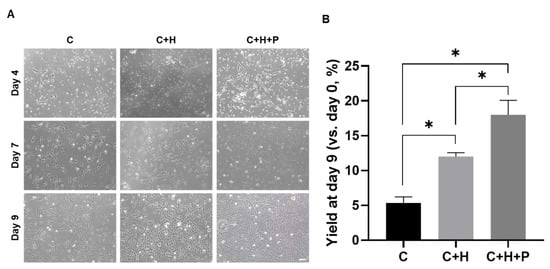 In order to assess the proliferation and yield of the WJ-MSC primary culture, according to incubation conditions, cell confluency was observed by optical microscopy on the 4th, 7th, and 9th days; the cells were also collected on the 9th day in order to calculate yields (Figure 1). When the WJ-MSCs at passage 0 were exposed to standard incubation conditions (5% CO2, 37 °C incubator, as a control), or to the 5% O2 hypoxia conditions (C+H), or the 5% O2 hypoxia with 2.0 PSI pressure conditions (C+H+P), confluency changes were observed (Figure 1A). Since the primary culture (passage 0) was carried out using a cell mixture separated from umbilical cord tissue, a number of cells were generally observed on the 4th day of incubation. However, a relatively increased cell population was observed by the 7th and 9th day of incubation. Compared with the control group (standard incubation conditions), the initial adhesion of the cells was enhanced under the hypoxic, and hypoxia under high-pressure conditions, and the rate of cell adhesion was the highest under the hypoxia with high-pressure, conditions. When observing the cell proliferation up to the 9th day, the confluency was higher under the hypoxia with high pressure and the hypoxia conditions than under the control condition. Similarly, to the cell adhesion rates, cell proliferation under hypoxia with the high-pressure condition was most marked.
