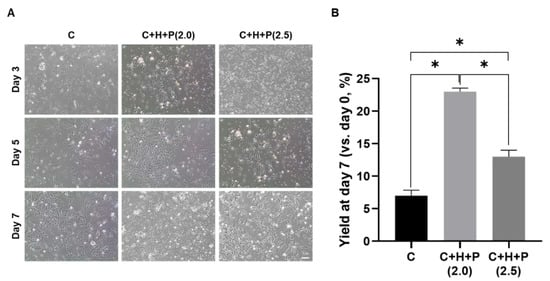 Confirmation of the yield of Wharton’s jelly-derived mesenchymal stem cells (WJ-MSCs) under different high-pressure conditions. (A) Observation of the shape of the cells through an optical microscope on the 3rd, 5th, and 7th days of the initial culture of the WJ-MSCs. The WJ-MSCs were cultured under control, 5% hypoxia with 2.0 PSI, or 5% hypoxia with 2.5 PSI pressure conditions. Scale bar = 100 µm. (B) Calculation of the yield of the WJ-MSCs by 7 days post WJ-MSC seeding. C: 5% CO2, 37 °C as a control; C+H+P (2.0): control + 5% O2 hypoxia + 2.0 PSI; C+H+P (2.5): control + 5% O2 hypoxia + 2.5 PSI. The data are presented as mean ± S.E.M. * p-value < 0.05. Six batches per groups were assigned and tested.