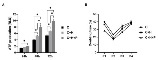 The viability and doubling time of the primary WJ-MSCs, cultured under 2.0 PSI pressure with 5% hypoxia, were determined. An adenosine triphosphate (ATP) assay was performed at 24-, 48-, and 72-h post-initial cultivation under each incubation condition (Figure 3). The production of ATP under the high-pressure conditions with hypoxia showed the highest increase compared to the standard incubation or hypoxia-only conditions (Figure 3A). The difference between the three groups widened as the incubation time increased.
