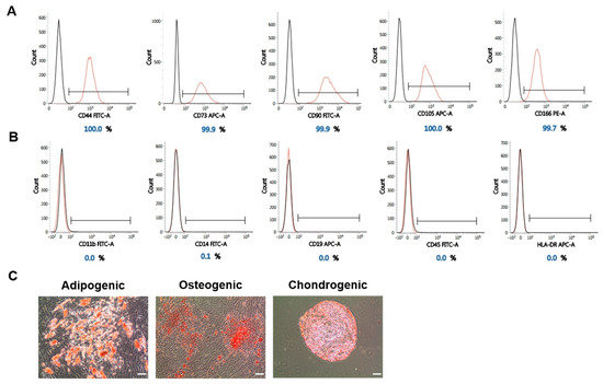 Stemness confirmation of Wharton’s jelly-derived mesenchymal stem cells (WJ-MSCs) exposed to the 5% hypoxia with 2.0 PSI pressure conditions. (A) The expression of MSC-positive markers (CD44, CD73, CD90, CD105, and CD166) was evaluated. (B) The expression of MSC-negative markers (CD11b, CD19, CD14, CD45, and HLA-DR) was evaluated. (C) WJ-MSCs were induced to differentiate into three-lineage cell types (adipogenic, osteogenic, and chondrogenic). Scale bar = 100 µm.