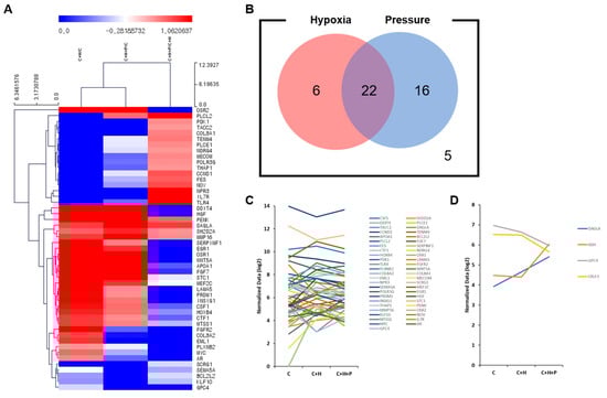 The 3′-mRNA sequencing analysis under high-pressure conditions. (A) Gene clustering analysis was conducted for 49 genes related to cell proliferation. The upregulated genes are represented in red, and the down-regulated genes are represented in blue. The name of each gene is shown to the right of the clustering map, and the groups or genes with similar expression patterns as a result of clustering were placed close together. (B) The genes upregulated upon exposure of the cells to high pressure and/or hypoxia are shown in the Venn diagram. The number of genes with increased expression under hypoxia only, under high pressure only, of under both conditions are shown inside of the circles, and the number of genes with decreased expression under these conditions is marked on the outside. (C) The mRNA expression change in the 49 selected genes, in relation to cell proliferation, is described as an expression plot. Under the C, C+H, and C+H+P conditions, the amount of the expression of each gene was normalized and converted to a log2 value. (D) DAGLA and CRLF3 are related to cell proliferation; GCP4 is related to the cell cycle; and XDH is related to therapeutic efficacy; these genes were selected and presented on the expression graph. C: control, C+H:+hypoxia, C+H+P: + hypoxia + pressure.