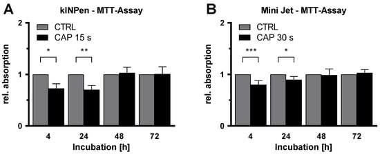 Inhibition of metabolism of endothelial cells after CAP-treatment. HDMEC were treated with cold atmospheric plasma (CAP) generated by a kINPen (A) or Mini Jet (B) device and incubated up to 72 h. MTT assays were performed at the indicated time points. Absorption was measured and normalized to the number of viable cells. Data were normalized to the argon-treated control cells and are presented as mean ± SD. At least 5 independent experiments, each with three replicates, was performed. Two-way RM ANOVA was used before normalization. The results of the Sidak’s post-hoc tests are indicated as follows: p < 0.05 (*), p < 0.01 (**), p < 0.001 (***).
