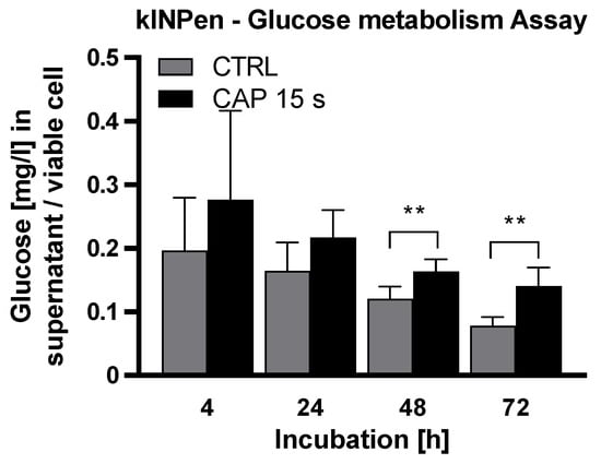 The cell glucose uptake after CAP treatment was measured to further investigate the effects of CAP treatment on cell metabolism. For this purpose, the glucose concentration in the culture medium was determined 4, 24, 48 and 72 h after the treatment. The measured concentration was normalized to the number of living cells. The glucose concentration of the cell culture medium per cell differed significantly (F (1, 10) = 9.897) between CAP and the control (Figure 3). Then, 48 and 72 h after treatment the glucose concentration per cell was significantly (48 h: p = 0.009, 72 h: p = 0.007) higher in the CAP treated group (48 h: CAP: 0.1634 ± 0.0167, CTRL: 0.1206 ± 0.0168, 72 h: CAP: 0.1405 ± 0.0257, CTRL: 0.0783 ± 0.0116).