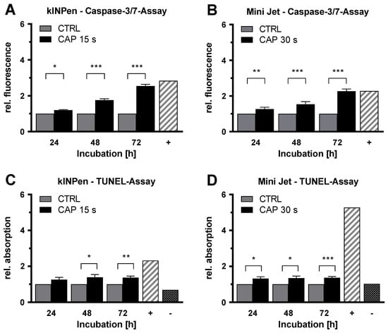 TUNEL assays confirmed the findings obtained by the caspase-3/7 assays. HDMEC were treated with CAP or argon gas and incubated for 24, 48, and 72 h. For treatment with both CAP devices, an increased signal of DNA fragmentation was observed (Figure 4C,D). The TUNEL signals increased 1.4 fold (p = 0.006) (kINPen) and 1.4 fold (p < 0.001) (Mini Jet) 72 h after CAP-treatment.