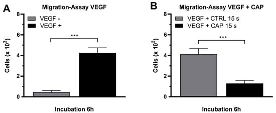The migration of endothelial cells into surrounding tissues is a key event of angiogenesis and is a directed process that can be stimulated primarily by the angiogenic factor VEGF. After it was shown that CAP-treatment inhibits the proliferation of HDMEC, the influence of CAP on the migration behavior of HDMEC was also investigated. For this purpose, a migration assay was established in which HDMEC migrated through the membrane of a FluoroBlok Transwell insert (Corning, New York, NY, USA; pore size 8 µm). The number of migrated cells was determined by fluorescence microscopy. In the presence of VEGF, the migration of HDMEC was statistically significantly increased. The number of migrated HDMEC increased 9.5-fold (p < 0.001) after an incubation of 6 h (VEGF–negative: 449 ± 157, VEGF–positive: 4250 ± 495 (Figure 5A).