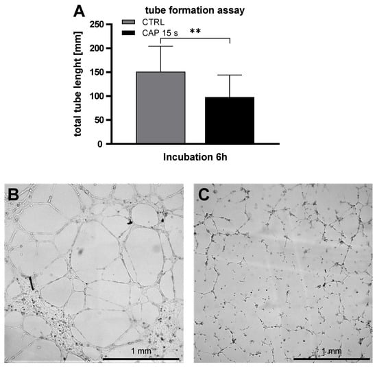 CAP inhibits the tube formation of HDMEC. HDMEC were treated with CAP or carrier gas Argon and seeded in µ-slides pre-coated with Matrigel/Medium. After an incubation period of 6 h, pictures were captured and the total tube length were analyzed with imageJ. The total tube length of the control treated HDMEC was significantly longer than the CAP treated cells (A). Six independent experiments were performed. Data are given as means ± SD. The data were statistically evaluated with the paired t-test: p < 0.01 (**). (B,C) show representative capture of control-(B) or CAP-(C) treated cells.