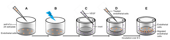 Migration assay. Endothelial cells were transferred in a well of a 24-well plate (A) and treated with cold atmospheric plasma (CAP) or argon carrier gas (B). Cell culture inserts were placed in another 24 well plates and a VEGF gradient was established over the membrane (C). Treated cells were transferred into the inset (D) and incubated over 6 h. Cells migrated through the membrane pores (E).