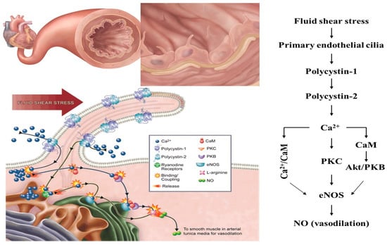 - Nauli, S.M.; Kawanabe, Y.; Kaminski, J.J.; Pearce, W.J.; Ingber, D.E.; Zhou, J. Endothelial cilia are fluid shear sensors that regulate calcium signaling and nitric oxide production through polycystin-1. Circulation 2008, 117, 1161–1171. [Google Scholar] [CrossRef] [PubMed]