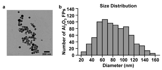 Al2O3 FPs were suspended in distilled water and observed and analyzed under transmission electron microscopy (TEM). The Al2O3 FPs were mostly spherical (Figure 1a) and their size varied from 20 to 160 nm (Figure 1b).