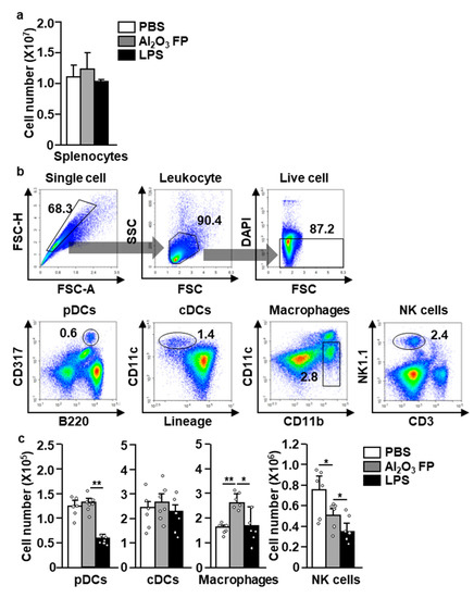 Then, we evaluated the inflammatory properties of Al2O3 FPs in the mouse in vivo, especially on innate immune cells. The C57BL/6 mice were intraperitoneally (i.p.) injected with 10 mg/kg of Al2O3 FPs. The lipopolysaccharide (LPS) was also injected into mice as a positive control. Six hours post-injection, the spleen was harvested, revealing that the total number of splenocytes was not changed by Al2O3 FPs (Figure 2a). We further analyzed the activation of innate immune cells by Al2O3 FPs. As shown in Figure 2b, the pDCs (CD317+B220+ cells), cDCs (CD11c+lineage- cells), macrophages (CD11b+CD11c- cells), and NK cells (NK1.1+CD3- cells) were defined in the spleen. We found that the number of macrophages was significantly increased by the treatment with Al2O3 FPs, whereas the number of NK cells tended to decrease (Figure 2c). The numbers of pDCs and cDCs were unchanged in the spleen compared to those in the phosphate buffered saline (PBS)-treated controls (Figure 2c). Thus, these data indicate that the Al2O3 FPs promote an increase in the number of macrophages in the spleen.