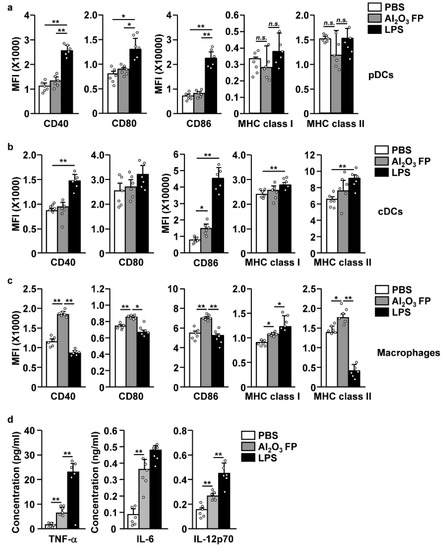We then examined the production of pro-inflammatory cytokines in the serum in response to Al2O3 FPs. The concentrations of tumor necrosis factor-alpha (TNF-α), interleukin (IL)-6, and IL-12p70 in the serum were substantially increased by Al2O3 FPs (Figure 3d). Thus, these data suggested that the Al2O3 FPs induce the activation of spleen macrophages, which contributes to the production of inflammatory cytokines in the serum.