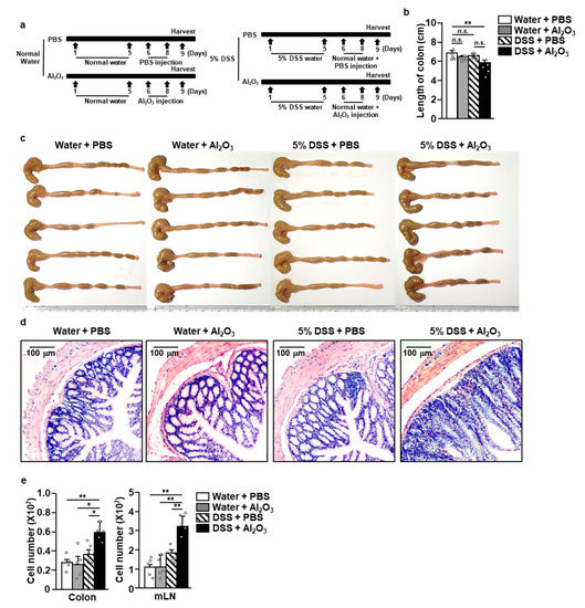 Al2O3 FPs exacerbated the dextran sulfate sodium (DSS)-induced colitis. C57BL/6 mice developed colitis as shown in the method section. (a) Schematic diagram of four groups: Water + phosphate buffered saline (PBS) (n = 5), Water + Al2O3 FPs (n = 5), DSS + PBS (n = 5), and DSS + Al2O3 FPs (n = 5). On day 9, the mice were sacrificed and their colon and mesenteric lymph nodes (mLNs) were harvested. (b) Length of the colons. (c) The colons. (d) Hematoxylin and eosin (H&E) staining of the colons. (e) The numbers of colon-infiltrated leukocytes and the numbers of mLN cells (n = 10, 5 mice for two experiments, two-way ANOVA, mean ± SEM). * and ** represent p < 0.05 and p < 0.01, respectively.