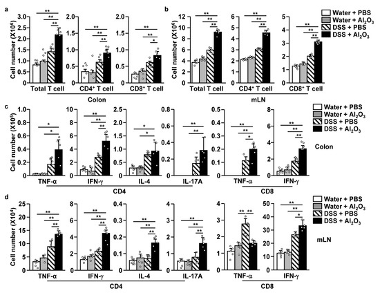 We further examined whether the Th1 and Tc1 responses induced by Al2O3 FPs contributed in the exacerbation of DSS-induced colitis. Treatment with DSS and Al2O3 FPs elicited great increases in the number of total T cells in the colon and mLN as well as CD4 and CD8 T cells compared to those in controls (Figure 6a,b). Moreover, the TNF-α-, IFN-γ-, and IL-17A-producing CD4 T cells in the colon and mLN were significantly increased by Al2O3 FPs compared to those in controls (Figure 6c,d). Furthermore, IFN-γ-producing CD8 cells were also increased dramatically, whereas TNF-α-producing CD8 T cells were not increased compared to those in controls (Figure 6c,d). The serum concentration of IFN-γ was also elevated significantly upon treatment with DSS and Al2O3 FPs in the mice, whereas that of TNF-α was not increased upon treatment with DSS and Al2O3 FPs compared to treatment with the Al2O3 FPs alone and DSS alone (Figure S4). Thus, these data suggested that the Th1 and Tc1 immune responses induced by Al2O3 FPs contributed in the exacerbation of the DSS-induced colitis.