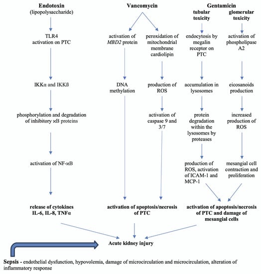 Petejova, N.; Martinek, A.; Zadrazil, J.; Kanova, M.; Klementa, V.; Sigutova, R.; Kacirova, I.; Hrabovsky, V.; Svagera, Z.; Stejskal, D. Acute Kidney Injury in Septic Patients Treated by Selected Nephrotoxic Antibiotic Agents—Pathophysiology and Biomarkers—A Review. Int. J. Mol. Sci. 2020, 21, 7115. https://doi.org/10.3390/ijms21197115