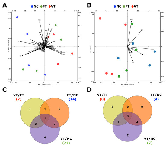 The metabolomic profiles of VT, FT, and NC in vivo developed embryos were compared in order to unravel the effects attributable to the embryo transfer procedure (FT vs. NC), to the vitrification procedure per se (VT vs. FT) and to the whole vitrified embryo transfer procedure (VT vs. NC). First of all, we carried out an untargeted metabolomics analysis of both semi-polar and non-polar fractions to gain a general overview of the metabolic changes occurring. The t-test analysis detected 40 differentially accumulated metabolites (DAMs) for at least one of the above comparisons, however, no significant associations were observed (false discovery rate, FDR > 0.05). Of these, 29 belonged to the semi-polar fraction and 11 to the non-polar. Principal components analysis (PCA) biplots demonstrated clustering among the three groups using the 87 and 27 metabolites detected in semi-polar and the non-polar fractions, respectively (Figure 1A,B).