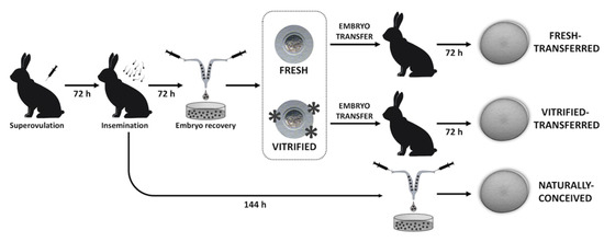 23. Marco-Jiménez, F.; Lavara, R.; Jiménez-Trigos, E.; Vicente, J.S. In vivo development of vitrified rabbit embryos: Effects of vitrification device, recipient genotype, and asynchrony. Theriogenology 2013, 79, 1124–1129. [Google Scholar] [CrossRef] [PubMed]