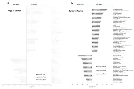 Bar chart representing the top comparing categories obtained by the functional enrichment analysis performed on differentially expressed genes. The top of decreased (Z-scores < −2) and increased functions (Z-scores > 2) was resulted by comparing polyps vs normal tissues (a) and tumors vs normal tissues (b).