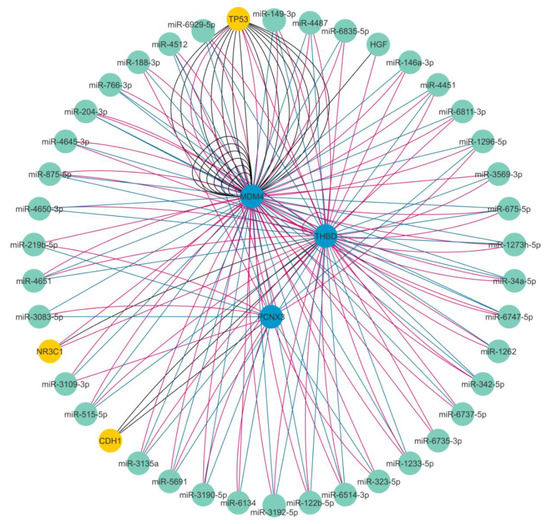 Overview of the ceRNA network showing the predicted interaction among mRNAs and miRNAs identified through in-silico analyses. The miRNAs are shown as green nodes, the mRNAs interacting with lncMRPS31P5 are shown as blue nodes, and the other mRNAs are shown as yellow nodes.
