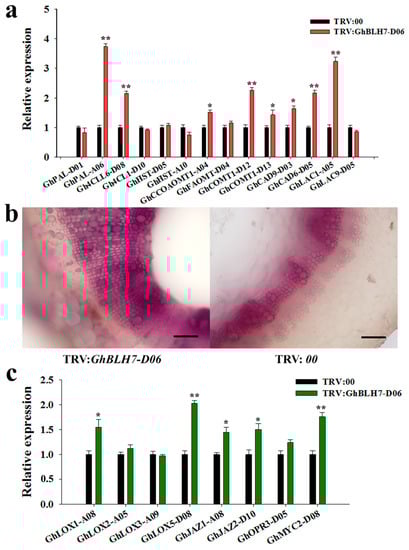 2.4. Silencing of GhBLH7-D06 in Cotton Activates the Biosynthesis of Lignin and JA Associated Genes
