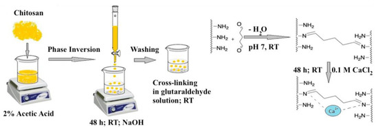 Schematic view of the synthesis of chitosan-derived beads under phase inversion synthesis with subsequent cross-linking via Schiff-base formation with glutaraldehyde and calcium-ion imbibing.