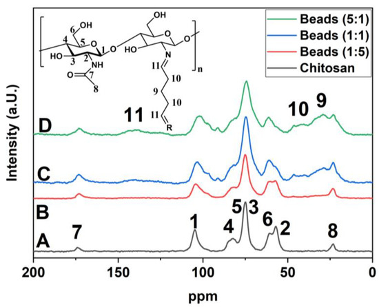 The 13C solids NMR spectra reveal that imine cross-linkages are more evident at higher ratios (1:1 and above ca. 140 ppm for newly formed N=C-groups; see peak 11 in Figure 2C,D), along with signatures ca. 20 and 45 ppm (peak number 9 and 10) for the presence of aliphatic carbons of glutaraldehyde. This trend corresponds to the level of glutaraldehyde cross-linking, where a stoichiometric excess of glutaraldehyde is required for effective cross-linking at these conditions. Also, the spectral intensity of the N=C-groups in the bead are influenced by the presence of Ca2+ due to the role of chelation on the cross-polarization dynamics of the system [50]. Aside from the NMR spectral confirmation of the products reported in Figure 2, there is a need to characterize the thermal stability of the biopolymer network since thermal analysis was reported to be sensitive to be sensitive toward the structure and bonding variability of the chitosan composites, as described elsewhere [51]. The results in Figure 3 outline the thermal analysis profiles for the bead systems.