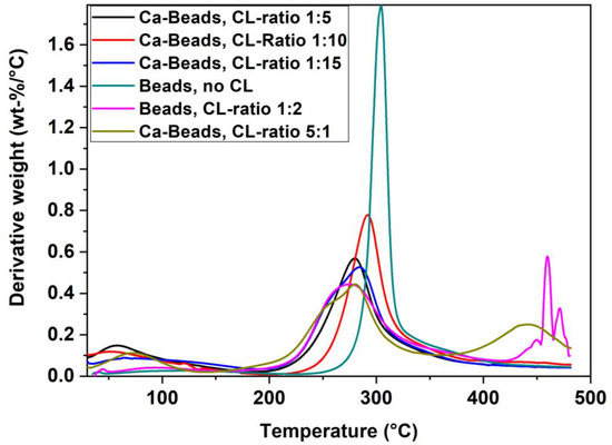 TGA profiles of the calcium doped beads with variable cross-linking (CL) ratios relative to the non-imbibed chitosan beads without cross-linking (no CL). The derivative weight scaling is truncated for the latter bead system.