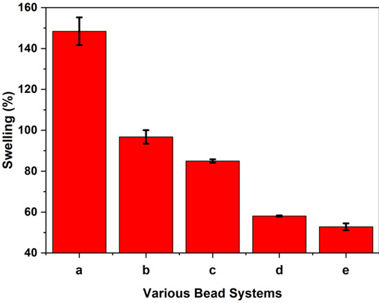 Swelling (%) for chitosan bead systems: non-modified beads (a), calcium imbibed beads with a CL- ratio of 1:10 (b), non-imbibed beads with a CL-ratio of 1:5 (c), calcium imbibed beads with a CL-ratio of 1:1 (d) and 5:1 (e).
