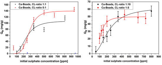 Sulfate adsorption isotherms with cross-linked and calcium imbibed beads (CL-ratio of 1:1 and 5:1 on the left, CL-ratio of 1:5 and 1:10 on the right (for beads with CL-ratio 1:15, see Figure S6 in the supplementary materials) at pH 5 and 295 K. The solid lines are the best-fit according to the Sips isotherm model (cf. Equation (2)).