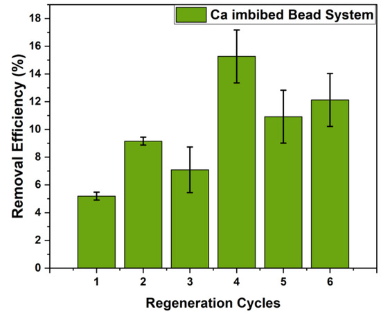 Previous reports indicate that biopolymer adsorbents may undergo loss of adsorption capacity after multiple cycles of adsorption-desorption. A key feature of sustainable adsorbent technology relates to a near constant level of removal efficiency after regeneration, along with minor susceptibility to degradation over time. Thus, the most promising bead material (5:1 calcium imbibed system) was evaluated for its sulfate adsorption-desorption properties. Sodium chloride solution is a viable agent for sulfate desorption, however, in case of the weakly coordinated Ca2+ species, competitive Na+ binding effects may lead to calcium leaching. To assess this effect, two Ca2+ imbibed bead systems (1:1 and 5:1 cross-linked systems) were tested using NaCl solution as the regenerant. Therefore, the supernatant was tested for Ca2+ leachate with Eriochrome Black T as the indicator [73]. Both the 5:1 and 1:1 systems showed some leaching, whereas the 1:1 system was less evident. To address leaching effects, the regeneration of beads used 0.1 M CaCl2 solution as an alternative regenerant media. The results for the 5:1 cross-linked bead material are presented in Figure 6. Prior to cycle 1 (cf. Figure 6), the regeneration studies required soaking of the beads for 24 h in Millipore water. The beads were then added to the sulfate solution (1000 ppm), where six cycles of regeneration were carried out. In general, a slight increase occurs from the first to the last cycle, indicating that these bead systems have good stability overall across multiple cycles of regeneration, according to the reported standard errors. A precedence for the regeneration method reported in Figure 6 finds support in a fixed-bed column study reported by Solgi et al. [74]. Therein, the recyclability of chitosan materials using aqueous CaCl2 revealed reproducible sulfate adsorption over multiple cycles of adsorption-desorption.