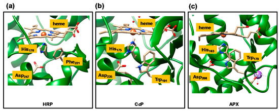 Active site structures of (a) horseradish peroxidase (HRP; 1H58 pdb), (b) cytochrome c peroxidase (CcP; 1CCA pdb), (c) ascorbate peroxidase (APX; 1OAF pdb).
