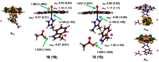 Electronically, all B and D model species are described by the same molecular orbital occupation with unpaired electrons as π*xz, π*yz and πTrp orbitals. The former two are the antibonding interactions along the Fe–O axis, whereas the πTrp orbital is a π-orbital on the axial Trp residue. In addition, the high-lying porphyrin orbital, i.e., a2u, is doubly occupied in 2,4B and 2,4D. As such structures, B and D can be described with the overall electronic configuration π*xz1 π*yz1 a2u2 πTrp1, whereby the doublet spin states have the Trp radical as a down-spin, while it is an up-spin in the quartet spin states. Thus, the addition of the hydrogen-bonding distal network and the point charge to the minimal models (A/C) to get B/D leads to the polarization of the charge distributions and gives a Trp radical rather than a heme radical. This is in agreement with experimental electron paramagnetic resonance (EPR) and electron nuclear double resonance (ENDOR) spectroscopy studies that located a Trp radical in CcP Cpd I [48,49].