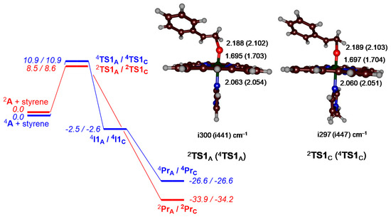Potential energy landscape of styrene epoxidation by 2,4A and 2,4C as calculated at UB3LYP/BS1 in Gaussian-09. Energies (UB3LYP/BS1//UB3LYP/BS2+ZPE+Esolv) are in kcal mol−1 with respect to isolated reactants and give values for the reaction of A/C and doublet spin results in red and quartet spin results in blue. Optimized geometries of the rate-determining transition states give bond lengths in angstroms and the imaginary frequency in cm−1.