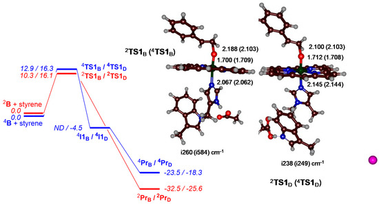 Potential energy landscape of styrene epoxidation by 2,4B and 2,4D as calculated at UB3LYP/BS1 in Gaussian-09. Energies (UB3LYP/BS1//UB3LYP/BS2+ZPE+Esolv) are in kcal mol−1 with respect to isolated reactants and give values for the reaction of B/D and doublet spin results in red and quartet spin results in blue. Optimized geometries of the rate-determining transition states give bond lengths in angstroms and the imaginary frequency in cm−1.
