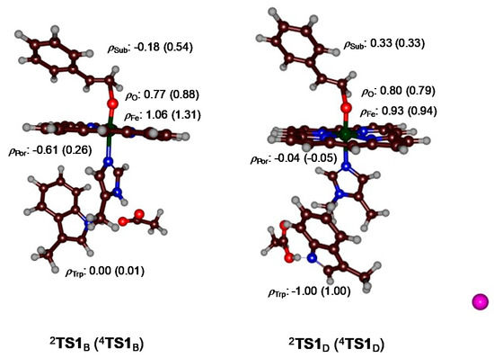 In transition state 2,4TS1B, the third unpaired electron appears to be located on the porphyrin macrocycle and a spin of ρPor = −0.61 (0.26) in the doublet (quartet) spin state is found. At the same time, radical character starts to develop on the styrene group: ρSub = −0.18 (0.54) in the doublet (quartet) spin state. By contrast, a full radical is found on the Trp unit in 4,2TS1D (ρTrp = −1.00 in 2TS1D and ρTrp = 1.00 in 4TS1D). Clearly, the lack of a hydrogen bonding network in the large model has a dramatic effect on the charge distributions and moves the spin density to the Trp unit, while there is none in the hydrogen bonded system.