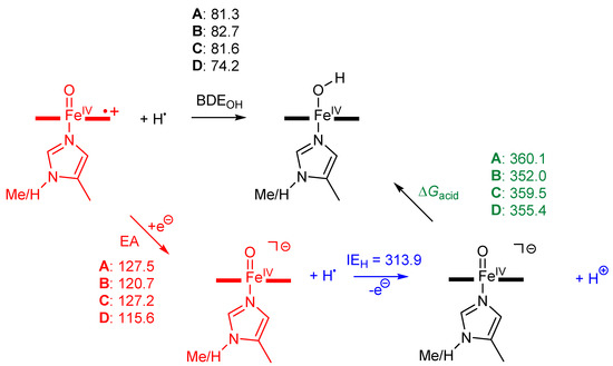 Firstly, the thermochemical cycle includes the one-electron reduction potential (reaction in red on the left-hand side of Figure 6) as the energy difference between Compound I and its one-electron reduced form or the electron affinity (EA) of Compound I. Secondly, the bond dissociation energy of the O–H bond (BDEOH) was calculated as the energy difference between the iron(IV)–hydroxo complex and Compound I and an isolated hydrogen atom; see Equation (4). The ionization energy of a hydrogen atom (IEH) was taken from experimental data [109]. Finally, the gas-phase acidity of the iron(IV)–hydroxo complex was estimated from the cycle in Figure 6 using the experimental ionization energy (IEH) of a hydrogen atom [109], the EA of Compound I and the BDEOH of the iron(IV)–hydroxo complex, as described in Equation (5).