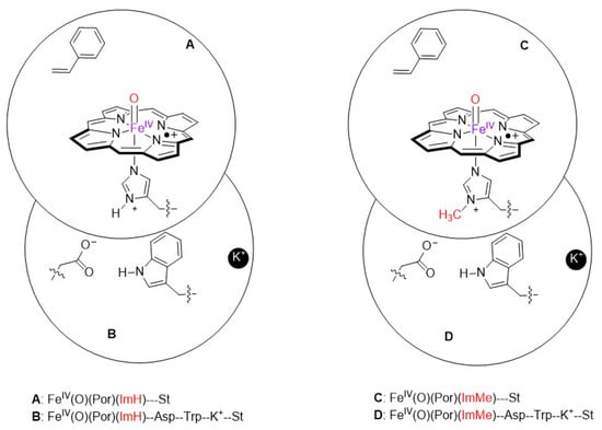 Models A, B, C and D, studied as models of peroxidases and Nδ-methyl histidine (HisMe)-engineered peroxidases, as investigated in this work. Por stands for porphyrin, St is styrene, ImH is imidazole and ImMe is methyl imidazole.
