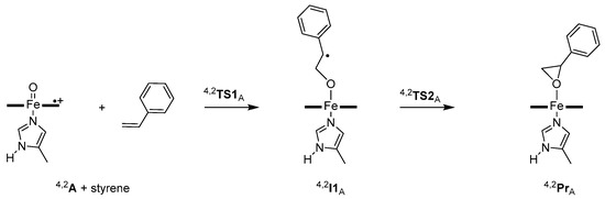 To test the catalytic effects of engineering the axial histidine ligand in peroxidases to Nδ-methyl histidine, we investigated the mechanism of oxygen atom transfer from Cpd I to a substrate with styrene as a model substrate. Thus, styrene epoxidation is a typical model reaction for double bond activation and styrene has been used as model substrate in many previous studies for biomimetic and enzymatic reaction mechanisms [78,79,80,81,82]. The styrene epoxidation was studied by the minimal heme models 2,4A and 2,4C, which contain the iron(IV)–oxo group inside a bare porphyrin and with imidazole or Nδ-methyl imidazole as the axial ligand. These minimal models should give an insight into the electrostatic effects of replacing the axial ligand with Nδ-methyl histidine on the styrene epoxidation reaction. Subsequently, the same reaction was also explored for the expanded models 2,4B and 2,4D that show the effect of the proximal hydrogen bonding network and the second-coordination sphere on structure and reactivity. The overall reaction mechanism explored for all systems (4,2A, 4,2B, 4,2C and 4,2D), although only the general pathway, is shown in Scheme 3 for model A. The same labels of the transition states and local minima are used for the reactions for model B, C, and D and these letters are given in subscript after the label. The reactions start from a long-range complex of styrene with the Cpd I model, i.e., an iron(IV)–oxo heme cation radical, for models A, B, C, and D in the doublet and quartet spin states. Subsequently, we follow the reaction for the C–O bond formation with the terminal carbon atom of styrene to form a radical intermediate (I1) via a C–O bond formation transition state TS1. Thereafter, a ring-closure transition state (TS2) separates the radical intermediates from epoxide product complexes (Pr). This mechanism was explored previously for double bond epoxidation by Cpd I of P450 and peroxidase model complexes [76,77,78,79,80,81,82,83,84,85,86,87,88,89,90,91,92] as well as engineered peroxidase systems with modified axial ligands [93,94]. In general, in these studies, TS1 is the rate-determining step and TS2 is small or negligible, and the overall reaction is highly exothermic.
