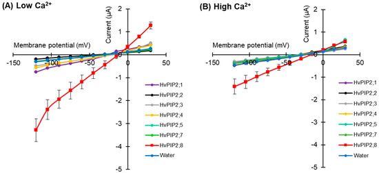 To test for HvPIP ion transport activity, two electrode voltage clamp (TEVC) experiments were conducted using X. laevis oocytes expressing HvPIP2s (from HvPIP2;1 to HvPIP2;8). This revealed that only the expression of HvPIP2;8 elicited large bidirectional and voltage-independent currents in the bath solution, including 86.4 mM NaCl and 9.6 mM KCl, and 30 µM free Ca2+ (low Ca2+ condition) (Figure 1A). Small currents were observed for HvPIP2;1 in low Ca2+ conditions, and in some experiments these currents were greater than the currents recorded for the water-injected controls (Table S2). When the bath solution contained a high Ca2+ concentration, 1.8 mM Ca2+, the HvPIP2;8-associated currents were smaller than in low Ca2+ conditions (Figure 1B). The HvPIP2;8-associated ionic conductance was 36.46 and 14.50 µS in low and high external free Ca2+ conditions, respectively, and these values were significantly higher than the ionic conductance of the water-injected oocytes (3.31 and 3.44 µS, respectively: Supplementary Table S2). HvPIP2;2, HvPIP2;3, HvPIP2;4, HvPIP2;5, and HvPIP2;7 did not elicit ionic conductance that was significantly different to that of the water-injected oocytes (Figure 1A,B, Supplementary Table S2).