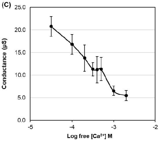 An increase in the MgCl2 concentration in the presence of 1.8 mM CaCl2 tended to partially cancel out the inhibitory effect of Ca2+ in relation to the ion channel activity (Figure 4C,D). These results indicate that there may be a competitive interaction between Ca2+ and Mg2+, which influences HvPIP2;8-mediated ion channel activity and the presence of more external Mg2+ can partially relieve the inhibitory effect of high Ca2+ on HvPIP2;8 ionic conductance.