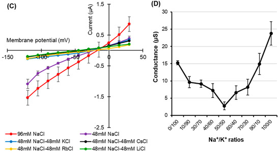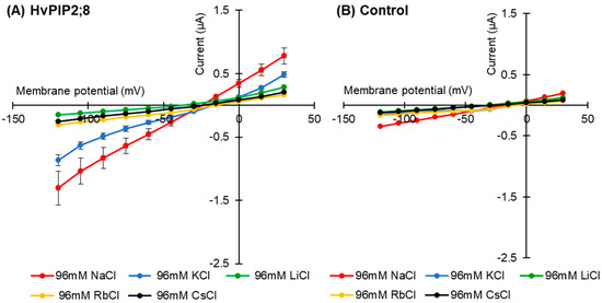Current–voltage relationships for the HvPIP2;8-expressing oocytes were recorded in the presence of 96 mM Na+, K+, Rb+, Cs+, or Li+ (as chloride salt; Figure 2A). When the oocytes were bathed in a 96 mM Li+, Rb+, or Cs+ solution, the HvPIP2;8-associated currents did not differ from the background currents recorded for the water-injected control oocytes; ionic conductance was only detected for the HvPIP2;8-expressing oocytes when bathed in either a Na+- or K+-containing solution (Figure 2A,B).