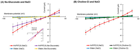 The effect of the presence of the external anion Cl− on HvPIP2;8 ion transport was tested using Na-gluconate and Choline-Cl solutions (96 mM each). Similar current–voltage relationships for HvPIP2;8-expressing oocytes were observed regardless of whether there was Cl− or gluconate solutions used in the bath (Figure 3A), and there was no shift in the reversal potential (−9 mV) for the different solutions, indicating that the HvPIP2;8-induced currents were not affected by Cl−. In the presence of 96 mM Choline-Cl, the HvPIP2;8-expressing oocytes elicited minor currents (−0.68 ± 0.42 µA at −120 mV), comparable to those of the water-injected control oocytes (−0.39 ± 0.03 µA at −120 mV), which was significantly different to the currents observed in the presence of 96 mM NaCl (Figure 3B). These results indicated that the HvPIP2;8-associated Na+-induced currents across the plasma membrane of the oocytes were not affected by the external Cl− concentration.