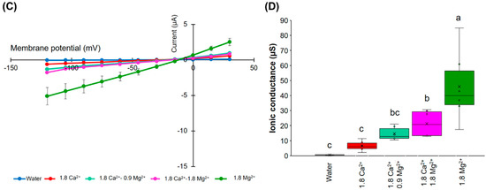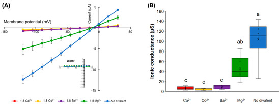 Effects of divalent cations on the ion current responses in oocytes expressing HvPIP2;8. (A) Effect of divalent cations on the ion currents of the HvPIP2;8-transporter; bath solutions with a high 1.8 mM Ca2+ background calcium conditions were successively replaced with either 1.8 mM Ca2+, Ba2+, Cd2+, and Mg2+ (as chloride salts), at concentrations of 86.4 mM NaCl and 9.6 mM KCl. (B) Box plot summary of the ionic conductance presented in (A); the ionic conductances were calculated from V = −75 mV to −120 mV. (C) Relief of Ca2+ inhibition by the addition of Mg2+ on the ion current responses in oocytes expressing HvPIP2;8; note the different range of the Y-axis from the plot in (A). (D) Box plot summary of the ionic conductance presented in (C). Steady-state current–voltage curves of the X. laevis oocytes injected with 10 ng of cRNA per oocyte were recorded. Currents from the oocytes injected with water were the negative controls from the same batch. Significant differences (p < 0.05) are indicated by different letters using one-way ANOVA with Duncan’s multiple comparisons test. Data are the means ± SE of three independent experiments, (n = 6 for A,B).