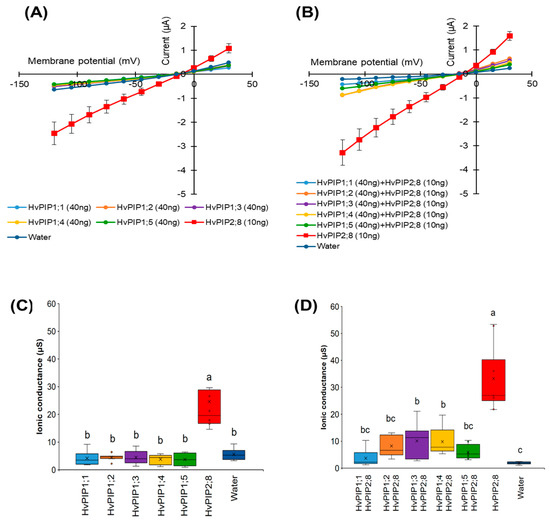 Co-expression of HvPIP1s and HvPIP2;8 reduces HvPIP2;8-dependent currents in X. laevis oocytes. (A) Current–voltage relationships obtained from oocytes either expressing HvPIP2;8 alone, each HvPIP1 alone, or injected with water; each HvPIP1 of the five HvPIP1s did not show ion channel activity when expressed alone. (B) Co-expression of HvPIP2;8 with each HvPIP1 largely inhibited the ion channel activity of HvPIP2;8. (C,D) Box plot summary of the ionic conductance for data shown in (A,B), respectively. Oocytes were injected with 10 ng cRNA of HvPIP2;8, 40 ng cRNA of each HvPIP1 in both the solo- and co-expression analyses. The bath solution included 86.4 mM NaCl, 9.6 mM KCl, 1.8 mM MgCl2, 1.8 mM EGTA, 1.8 mM CaCl2, 10 mM HEPES, and a pH 7.5 with Tris, and therefore the free Ca2+ concentration was 30 µM. Significant differences (p < 0.05) are indicated by different letters using one-way ANOVA with Duncan’s multiple comparisons test. Data are the means ± SE (n = 8).