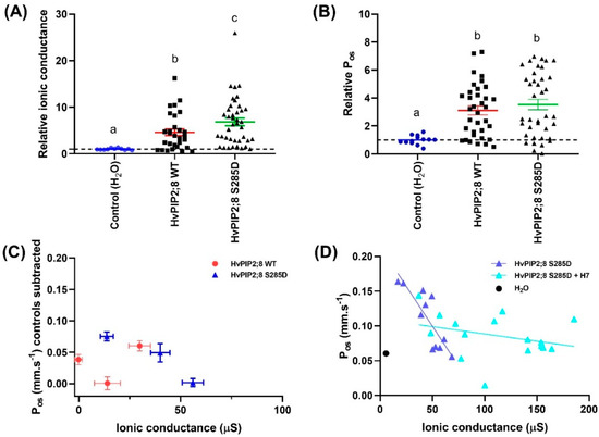 2.6. An HvPIP2;8 S285D Phosphomimic Mutant Had Greater Ionic Conductance Than Wild Type HvPIP2;8